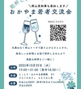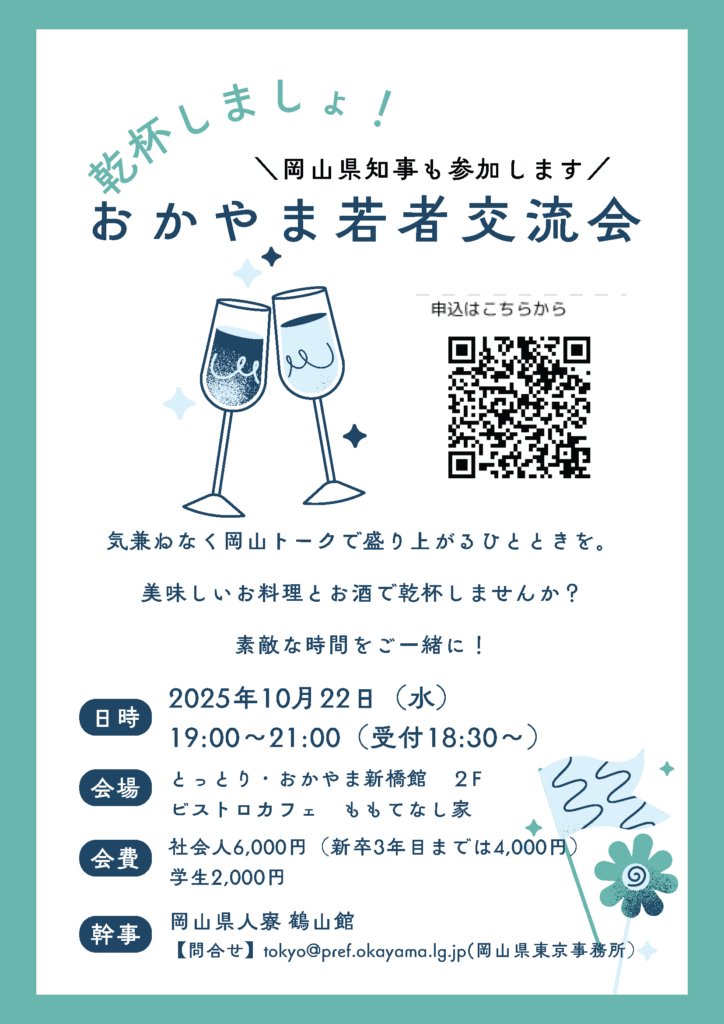「おかやま若者ネットワーク交流会」のお知らせ 京浜同窓会・中村2025年10月19日0 岡山県東京事務所主催「おかやま若者ネットワーク交流会」のお知らせ 10/22、とっとり・おかやま新橋館にて「おかやま若者ネットワーク交流会」が開催されます。 気兼ねなく岡山トークで盛り上がるひとときを。 美味しい料理とお酒で乾杯しませんか? 岡山県知事も参加されます! 参加したい方は下記チラシを参照の上お申し込みください。 (お問い合わせは岡山県東京事務所にお願いします) Post Views: 41